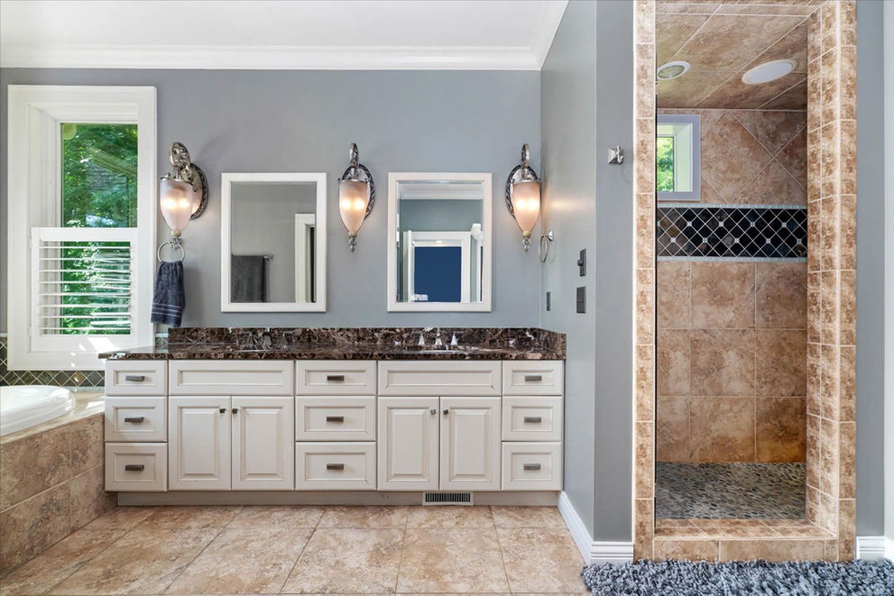 spacious ceramic walk-in shower, a separate whirlpool tub, a double vanity, and generous his and hers closets