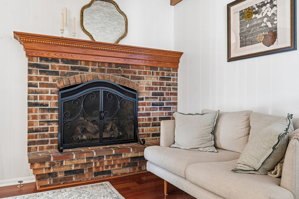 warm hardwood floors, a cozy brick fireplace, and plenty of natural light throughout. The kitchen offers white cabinetry,